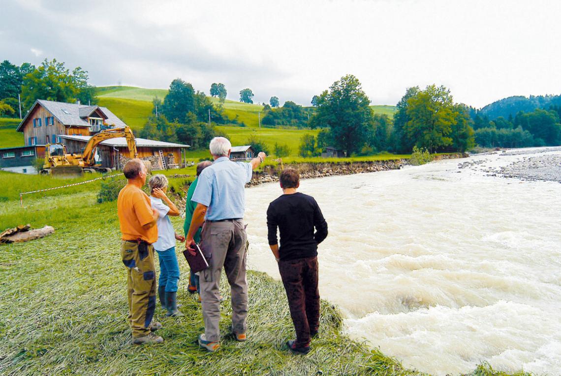 Ein paar Tage nach der Katastrophe beraten die Familie Duss und Martin Zemp, Ingenieurbüro Felder und Zemp AG, wie die weggerissene ARA-Leitung am schnellsten repariert werden könnte. [Archivbilder EA]