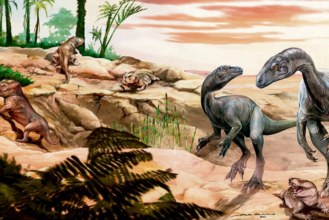 Eine künstlerische Rekonstruktion des Dinosauriers Huayracursor jaguensis (rechts). [Bilder Conicet]
