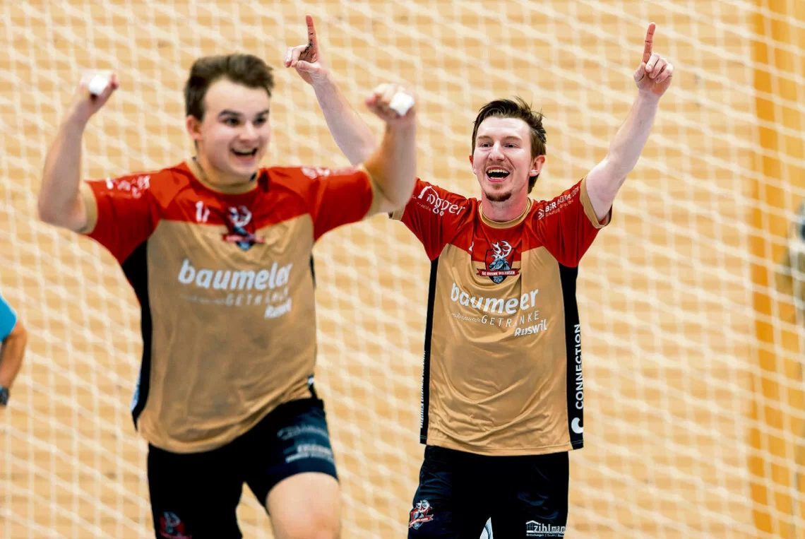 Mit dem Schlusspfiff setzt bei den 2. Liga-Herren der SG Ruswil Wolhusen grosser Jubel und Erleichterung ein. Im Bild (links) René Grüter und Severin Schaller. [Bild ps]