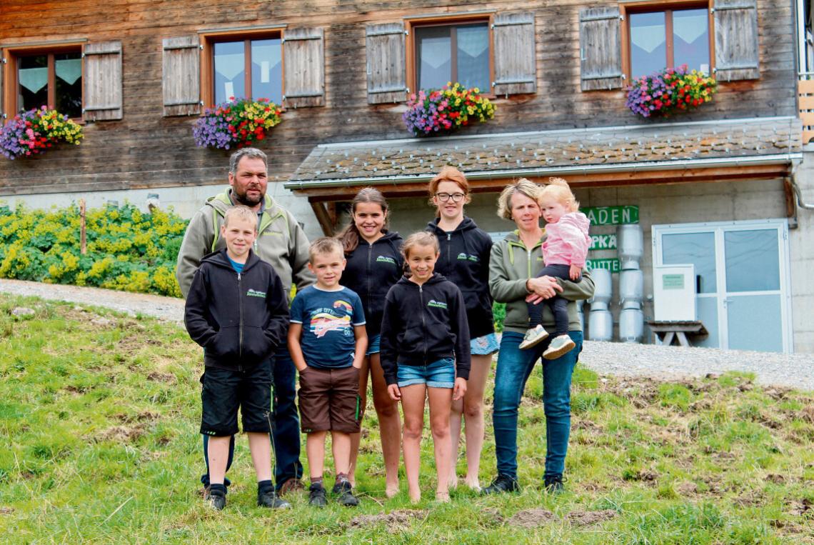 Familie Theiler, das sind (vorne, von links): Nik (12 Jahre), Marc (8), Katja (10); hinten Reto Theiler, Melina (14), Lisa (16) sowie Sili mit Leana (2) auf dem Arm. [Bild Claudia Hoch-Rieger]