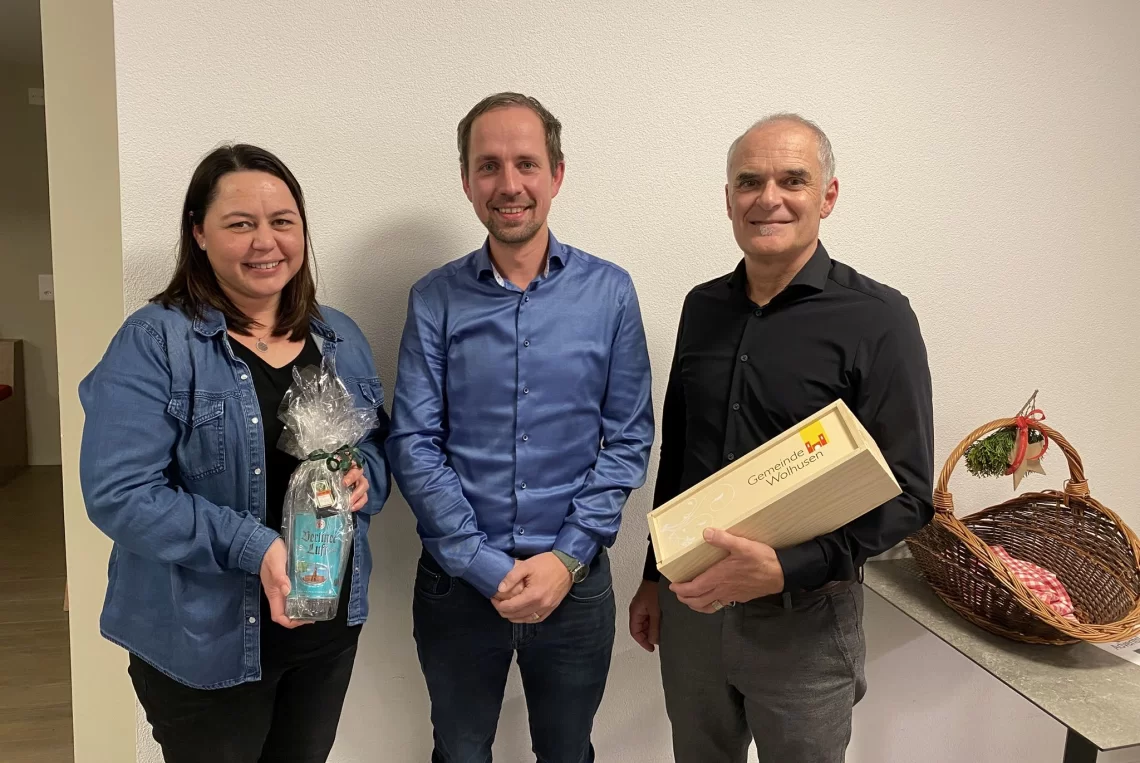 Geschäftsführer David Schmid (Mitte) mit den Geehrten Melanie Bucher (links, Weiterbildungsabschluss) und Benedikt Küng (Dienstjubiläum).
