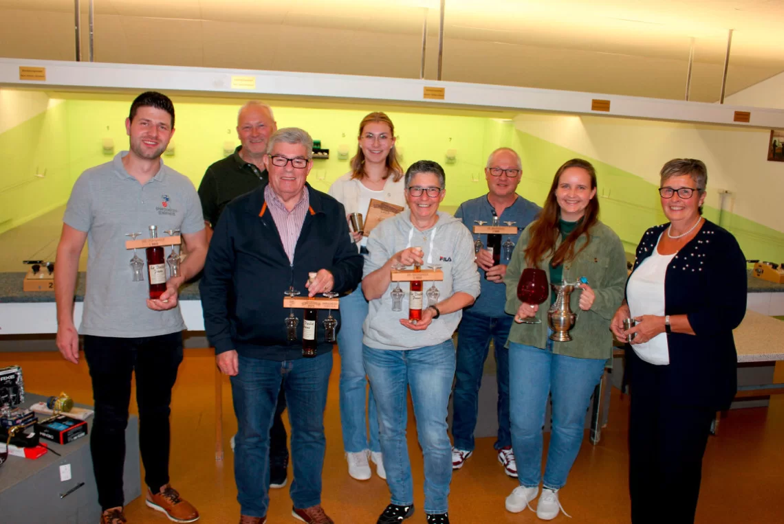 Die Podest-Schützinnen und -Schützen der diesjährigen Schützenkilbi (von links): hinten: Thomas Steffen, Herbert Felder, Janine Wicki, Patrick Distel; vorne: Josef Thalmann, Daniela Schöpfer, Sandra Müller, Priska Müller. [Bild zVg]