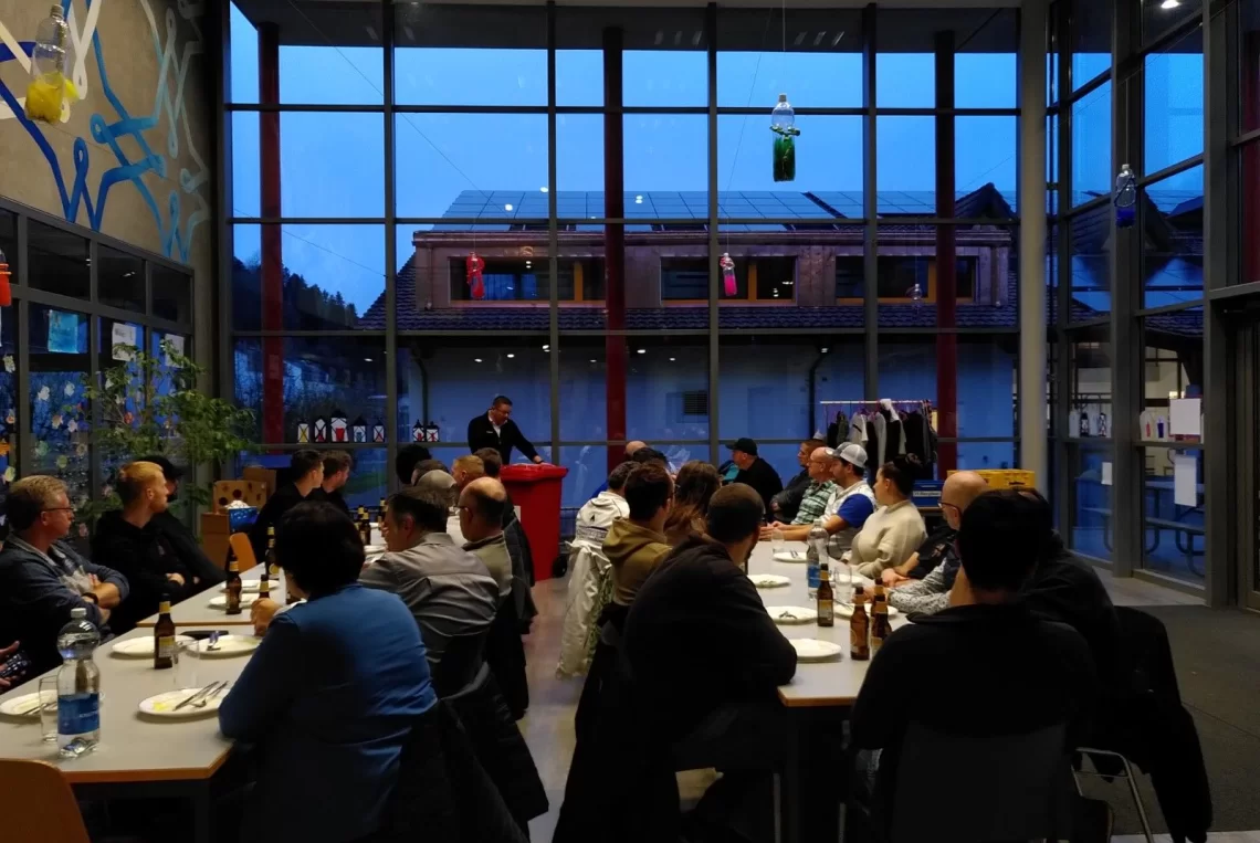 Sozialvorsteher Sascha Eigenmann dankt am Handwerkerapéro für die geleistete Arbeit an der Rümlighalle.