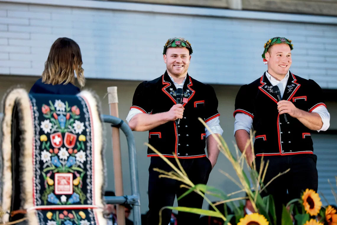 Die beiden Kranzgewinner geniessen den Empfang in Hasle sichtlich. [Bild Sven Duss]