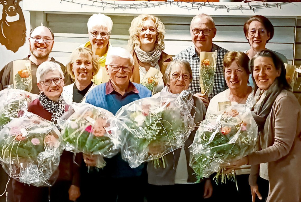 Geehrte und Wiedergewählte des Kirchenchors Flühli: hinten (von links): Bruder Pascal, Anna Schmidiger, Rita Christen, Koni Christen, Susi Zihlmann. Vorne (von links): Romy Bieri, Marianne Messerli, Franz Wicki, Heidi Schnider, Anni Thalmann, Margaretha Kazarowa. [Bild Ä.Sch.]